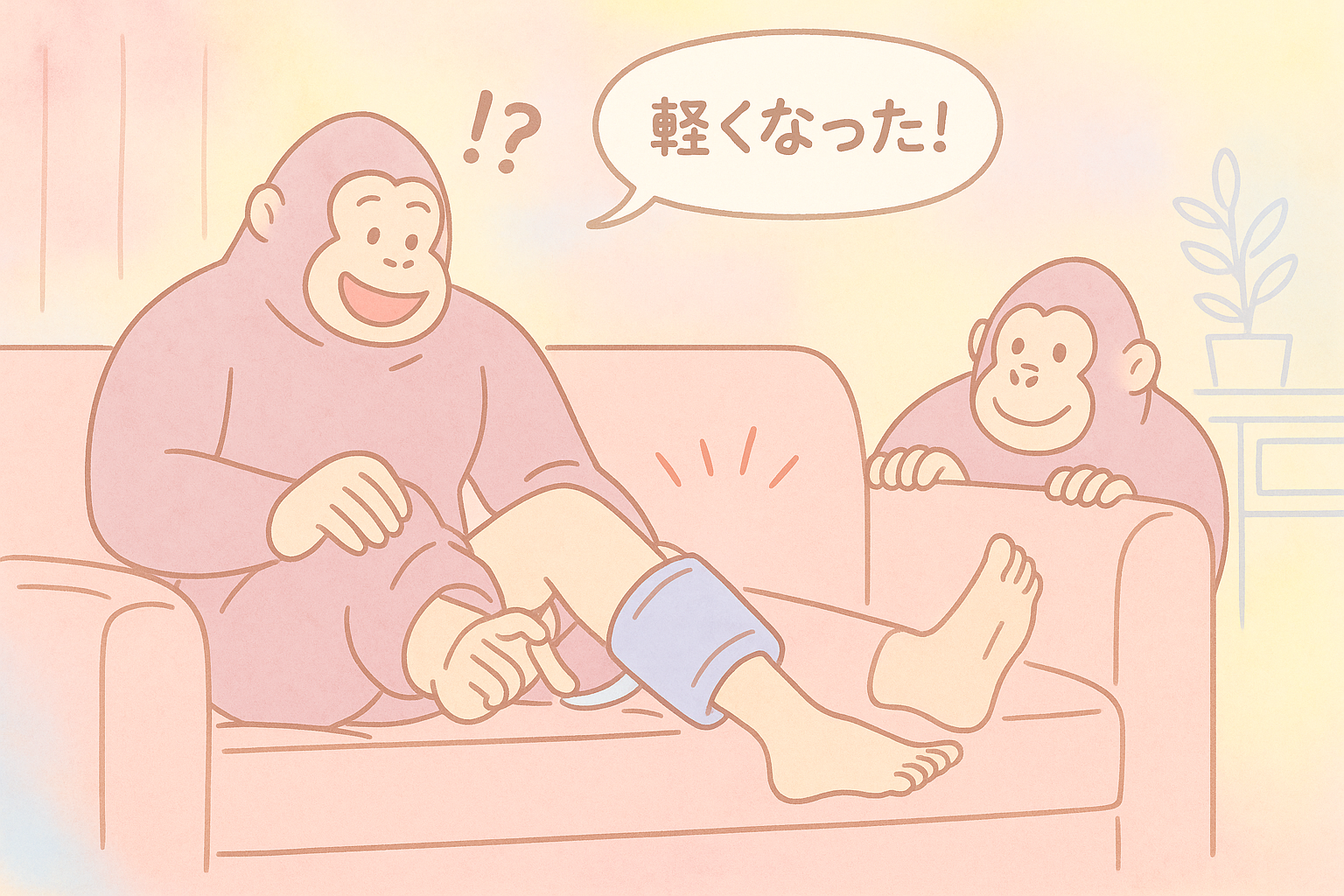 ゴリラのひとつかみは、空気圧による“もみほぐし”で筋肉を刺激し、血液やリンパの巡りをサポートします。これにより、一時的に脚のだるさがやわらぐ効果が期待できます。